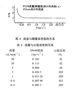 由EMF的測量原理可知,其流量的下限由同噪聲或偏移的信噪比S/N 來決定,其上限則由測量管內襯里的磨損和配管的經(jīng)濟速度等來決定。一般當測量管內實際流速小于0.1m/s時,感應電動勢已變得十分微弱(幾微伏至零點幾微伏),此時噪聲的影響逐步變?yōu)橹鲗В踔裂蜎]信號電動勢。其流速和測量誤差的關系詳見圖 5和表2。