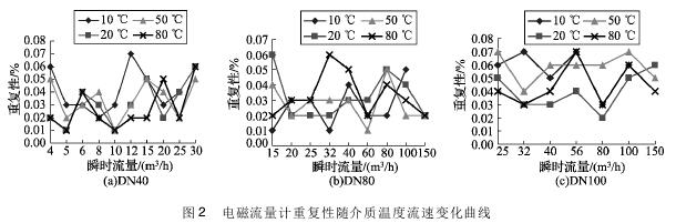 將實(shí)驗(yàn)測得的耐腐蝕排污管道流量計在不同溫度及流速下的重復(fù)性數(shù)據(jù)整理,特性曲線如圖2所示,3組曲線分別對應(yīng)DN40、DN80、DN100的3塊耐腐蝕排污管道流量計的重復(fù)性曲線。
