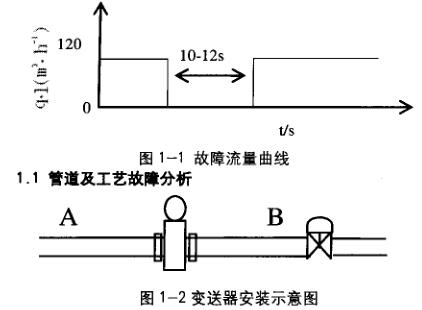 被測液從A流向B(如圖1-2),傳感器水平安裝,電極水平,傳感器下游2m處裝有調(diào)節(jié)閥,從圖中可以排除由于傳感器中急劇潴留氣和傳感器后無背壓等情況導(dǎo)致的測量脈動情況產(chǎn)生。