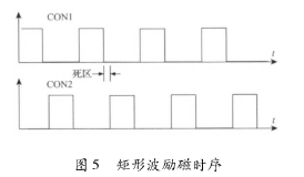 該電路主要由勵(lì)磁時(shí)序發(fā)生單元、三態(tài)緩沖器及隔離光耦組成。勵(lì)磁時(shí)序由冷凍鹽水流量計(jì)系統(tǒng)的控制核心產(chǎn)生。采用DSP的EPWM外設(shè)模塊,通過設(shè)定其內(nèi)部定時(shí)器的工作模式發(fā)出所要求的勵(lì)磁頻率的勵(lì)磁時(shí)序PWM信號(hào)CT_1和CT_2。由于勵(lì)磁控制系統(tǒng)中的勵(lì)磁工作電源的電壓要比DSP的工作電源電壓高得多,為防止勵(lì)磁電路故障對(duì)系統(tǒng)控制核心產(chǎn)生致命影響,采用光耦將控制部分與勵(lì)磁部分進(jìn)行隔離。另外,由于DSP引腳的驅(qū)動(dòng)能力有限,所以在DSP與隔離光耦之間加入三態(tài)緩沖器以驅(qū)動(dòng)隔離光耦的輸入級(jí)。并且,DSP能夠通過GPIO口控制三態(tài)緩沖器上的使能引腳來使能和禁止勵(lì)磁,以在檢測(cè)到電路故障時(shí)迅速關(guān)斷H橋所有橋臂。該勵(lì)磁時(shí)序產(chǎn)生電路通過軟件編程可產(chǎn)生如圖5所示的單頻矩形波。在實(shí)際應(yīng)用中,由于組成H橋的達(dá)林頓三極管與MOS管導(dǎo)通與關(guān)斷的時(shí)間不一致,易在勵(lì)磁方向切換瞬間,產(chǎn)生上下橋臂同時(shí)導(dǎo)通的現(xiàn)象,反映在勵(lì)磁電流波形上為一幅值很高的窄脈沖。該脈沖電流不僅容易引起遲滯比較電路的誤輸出,從而導(dǎo)致高低壓切換電路與電流旁路電路的誤動(dòng)作,而且對(duì)恒流控制電路產(chǎn)生沖擊,減小三端穩(wěn)壓芯片的使用壽命,同時(shí)還會(huì)產(chǎn)生EMC電磁干擾,給測(cè)量精度帶來影響。所以實(shí)際應(yīng)用時(shí),如圖5所示對(duì)方波勵(lì)磁時(shí)序添加死區(qū),可以明顯減小上述現(xiàn)象。