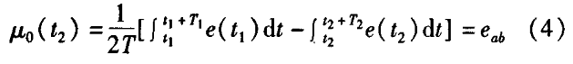 冷熱水流量計(jì)一般都采用工頻交流電源供電,其電源電壓的幅值和頻率的變化都會(huì)給冷熱水流量計(jì)帶來(lái)電源性干擾噪聲。對(duì)電源電壓的幅值變化,因采用多級(jí)集成穩(wěn)壓,一般而言電源電壓的幅值變化對(duì)電磁流量的測(cè)量精度影響不大。當(dāng)電源電壓的頻率波動(dòng)時(shí),雖然其波動(dòng)范圍有限,但對(duì)冷熱水流量計(jì)測(cè)量精度影響較大。為了解決工頻干擾問題,實(shí)現(xiàn)對(duì)流體流速感應(yīng)電勢(shì)e柚信號(hào)的準(zhǔn)確測(cè)量,需利用以下基本關(guān)系:①勵(lì)磁周期為工頻周期的整數(shù)倍,即勵(lì)磁頻率為50/nHz(n為偶數(shù));②正負(fù)勵(lì)磁下的同相位采樣。圖2是對(duì)應(yīng)低頻矩形波勵(lì)磁形式下的典型電勢(shì)信號(hào)形式,按上述關(guān)系在一個(gè)勵(lì)磁周期下,若假設(shè)t。和t:點(diǎn)為工頻干擾的等效干擾點(diǎn),且采樣寬度T=T1=T2,則e –ab的基本算式為:,