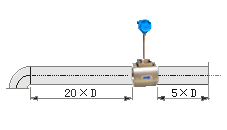 若傳感器安裝點(diǎn)的上游有90°彎并沒(méi)有或T形接頭,傳感器上游應(yīng)有不小于20D的等徑直管段,下游應(yīng)有不小于5D的等徑直管段。