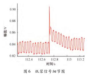 為了進一步研究水煤漿信號的特點,將其與紙漿信號進行對比。通過分析課題組采集的25Hz矩形波勵磁下的紙漿信號發(fā)現(xiàn),在同樣流速下,測量介質(zhì)為紙漿時,傳感器輸出信號經(jīng)調(diào)理放大后能明顯看到與流量相關(guān)的感應(yīng)電動勢信號,且其漿液干擾僅為數(shù)十毫伏,要遠(yuǎn)小于水煤漿信號中的漿液干擾,如圖5所示。對圖5所示的紙漿信號進行局部放大,得到如圖6所示的信號??梢?,紙漿信號中的漿液干擾持續(xù)的時間也遠(yuǎn)小于水煤漿信號中的漿液干擾,且頻率較低。