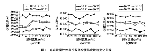 由圖1可得:( 1)隨著介質(zhì)溫度的升高,管道污水處理進出水口流量計的儀表系數(shù)均呈逐漸降低的趨勢。其中20℃和50℃的儀表系數(shù)基本相同,10℃和80 0C的儀表系數(shù)與20℃時偏離較大。(2)溫度對管道污水處理進出水口流量計的儀表系數(shù)在高溫以及低溫處影響明顯,以D N40管道污水處理進出水口流量計為例,儀表系數(shù)本次實驗高低溫處*大變化量約為0. 7% o ( 3)在管道污水處理進出水口流量計相應(yīng)的流量范圍內(nèi),在同一溫度下,隨著介質(zhì)流速的變化,管道污水處理進出水口流量計的儀表系數(shù)在個別點出現(xiàn)略微浮動,但整體變化不超過1 0. 2 %。