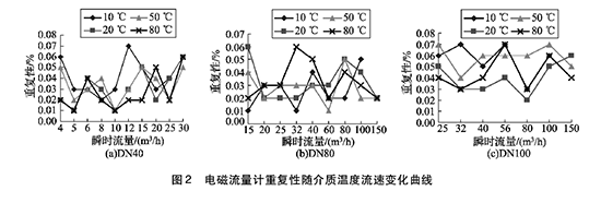 將實驗測得的管道污水處理進出水口流量計在不同溫度及流速下的重復(fù)性數(shù)據(jù)整理,特性曲線如圖2所示,3組曲線分別對應(yīng)DN40, DN80, DN100的3塊管道污水處理進出水口流量計的重復(fù)性曲線。