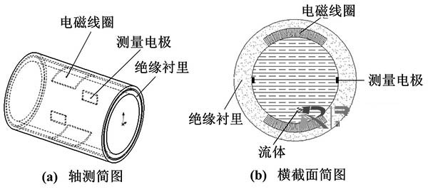 電容式工業(yè)污水流量計(jì)從根本上解決了電極表面附著、腐蝕、摩擦等問題,其電極與被測流體間有絕緣襯里隔離,或者直接采用絕緣測量管。電極置于測量管外面或鑲嵌于測量管內(nèi)部。嵌人式工業(yè)污水流量計(jì)和外貼式工業(yè)污水流量計(jì)的結(jié)構(gòu)如圖2所示。