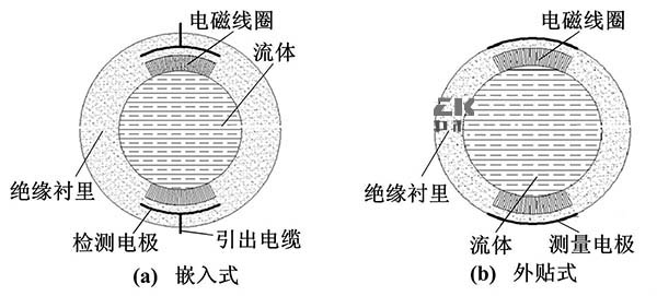 電極與被測流體通過絕緣管形成檢測電容,通過此電容來藕合流量信號(hào)。其主要的結(jié)構(gòu)形式按照電極的安裝位置可以分為兩種:電極嵌人測量管的絕緣襯里內(nèi)部(嵌人式)、電極貼在測量管外部(外貼式)。嵌入式結(jié)構(gòu)與普通工業(yè)污水流量計(jì)結(jié)構(gòu)相似,而外貼式大多是通過陶瓷表面金屬化技術(shù)將電極貼在測量管外。