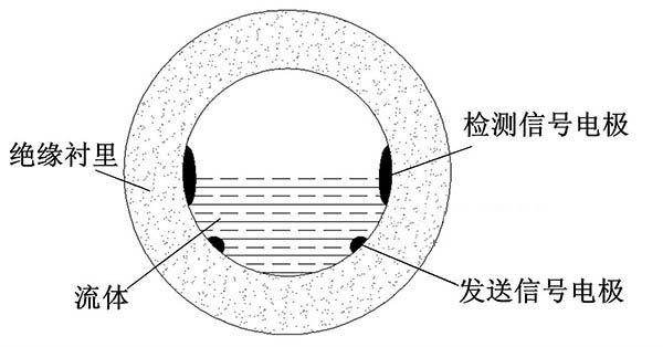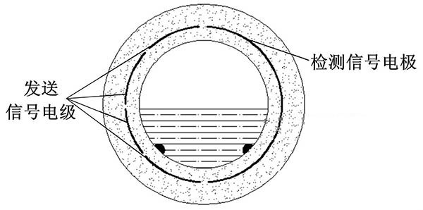 ③利用阻抗或信號(hào)衰減研制的非滿管工業(yè)污水流量計(jì)。這種結(jié)構(gòu)的非滿管工業(yè)污水流量計(jì)是當(dāng)前國內(nèi)研究的方向之一。其結(jié)構(gòu)是流量管底部貼一對(duì)信號(hào)發(fā)射電極,在流量管中間貼信號(hào)接收電極。由于信號(hào)在流體中傳播會(huì)產(chǎn)生衰減,且傳播時(shí)間越長,衰減越多,因此通過信號(hào)接收電極接收到的信號(hào)衰減量即可得知液面高度;同時(shí)該電極還能測量流體切割磁感線產(chǎn)生的電動(dòng)勢(shì),以此達(dá)到測量非滿管流量的目的。阻抗式或信號(hào)衰減非滿管工業(yè)污水流量計(jì)結(jié)構(gòu)簡圖如圖5所示。