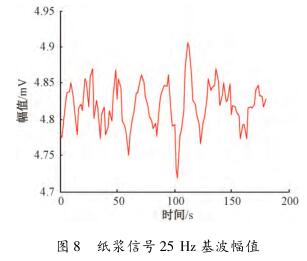 在頻域中對(duì)紙漿信號(hào)觀察時(shí)發(fā)現(xiàn),紙漿信號(hào)的漿液噪聲頻帶在零頻率點(diǎn)附近,距離流量信號(hào)基波頻率點(diǎn)較遠(yuǎn),對(duì)基波幅值和各奇次諧波幅值基本沒有影響,紙漿信號(hào)在頻域中的圖形如圖7所示。選擇一組采集的紙漿信號(hào),把其等分成數(shù)段,利用MATLAB計(jì)算每段數(shù)據(jù)在基波處的幅值并提取保存在一個(gè)數(shù)組中,使用繪圖工具畫出來,如圖8所示??梢?,基波幅值在4.7~4.95mV變化,波動(dòng)較小。因此,提取到的與流量相關(guān)的感應(yīng)電動(dòng)勢(shì)信號(hào)幅值會(huì)比較穩(wěn)定。