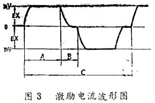 (1)激勵(lì)電流的波形檢查。在激勵(lì)電流檢查端EX+和EX一之間連接一個(gè)電阻(IΩ士0.1%),這個(gè)電阻與激勵(lì)線圈串聯(lián),示波器輸入端并聯(lián)在電阻上。若波形起伏很大時(shí),則不正常。波形正,負(fù)方向?qū)ΨQ,A一C測量周期值在規(guī)定的范圍內(nèi)則為正常,其波形如圖3所示。