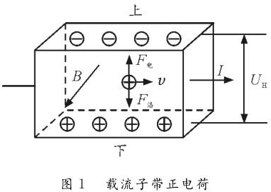 情形1:單種載流子。如圖1所示,若載流子帶正電荷,則載流子在洛倫茲力作用下會向下偏轉(zhuǎn),導(dǎo)體下表面積累正電荷。同時,上表面失去正電荷而帶上負(fù)電,從而使下表面電勢高于上表面。