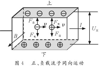 情形2:正、負(fù)載流子反向運(yùn)動。如圖3所示,長方體玻璃水槽中盛有NaCl的水溶液,水槽左、右側(cè)壁內(nèi)側(cè)各裝一導(dǎo)體片,在溶液中通入水平向右的電流,勻強(qiáng)磁場B垂直紙面向外。NaCl溶液中既有正離子,又有負(fù)離子,根據(jù)左手定則可判斷正離子受到向下的洛倫茲力,故向下運(yùn)動并堆積。同理,負(fù)離子也受到指向下的洛倫茲力,也向下運(yùn)動并堆積。由于正負(fù)離子均向下側(cè)面堆積,故上下兩側(cè)面的電勢均為零,但下側(cè)面處離子濃度大于上側(cè)面離子濃度。
