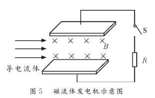 【例1】圖5為磁流體發(fā)電機(jī)示意圖。設(shè)兩金屬板間的距離為d,兩極板間勻強(qiáng)磁場的磁感應(yīng)強(qiáng)度為B。等離子體垂直進(jìn)入磁場的速度為v,單個離子所帶的電荷量為q。離子通道(即兩極板內(nèi)所圍成的空間)的等效電阻為r,負(fù)載電阻為R。則下列判斷正確的是( )
