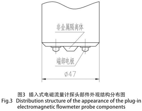 通過(guò)大量的試驗(yàn),對(duì)探頭端部外型結(jié)構(gòu)亦采用特殊設(shè)計(jì),從而消除兩個(gè)電極之間的擾流現(xiàn)象,同時(shí)亦消除因通電產(chǎn)生磁場(chǎng),導(dǎo)致兩個(gè)電極吸附介質(zhì)中的鐵屑而影響測(cè)量精度和死區(qū)效應(yīng),增強(qiáng)了輸出信號(hào)的穩(wěn)定性,從而提高傳感器準(zhǔn)確度和抗干擾性。通過(guò)結(jié)構(gòu)的優(yōu)化設(shè)計(jì),使用壽命更長(zhǎng),電磁流量計(jì)探頭局部,如圖 3 所示。