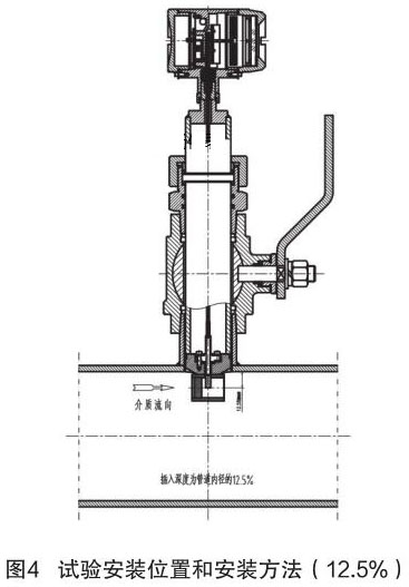根據(jù)中華人民共和國(guó)機(jī)械行業(yè)標(biāo)準(zhǔn):JB/T9249-2015《壓縮空氣流量計(jì)》進(jìn)行插入式壓縮空氣流量計(jì)的研制與設(shè)計(jì)。在試驗(yàn)過(guò)程中,因?yàn)槔碚撗芯坎怀浞郑偌由辖?jīng)驗(yàn)不足,采用插入深度是按照以往其它產(chǎn)品(插入式電磁流量計(jì))的經(jīng)驗(yàn),以插入深度為現(xiàn)場(chǎng)管道內(nèi)徑的 12.5% 進(jìn)行試驗(yàn),其對(duì)介質(zhì)流量的檢測(cè)值與同種規(guī)格管道法蘭式結(jié)構(gòu)的壓縮空氣流量計(jì)進(jìn)行比較,偏差值較大、儀表準(zhǔn)確度無(wú)法滿足設(shè)計(jì)要求。試驗(yàn)安裝位置和安裝方法如圖 4 所示。
