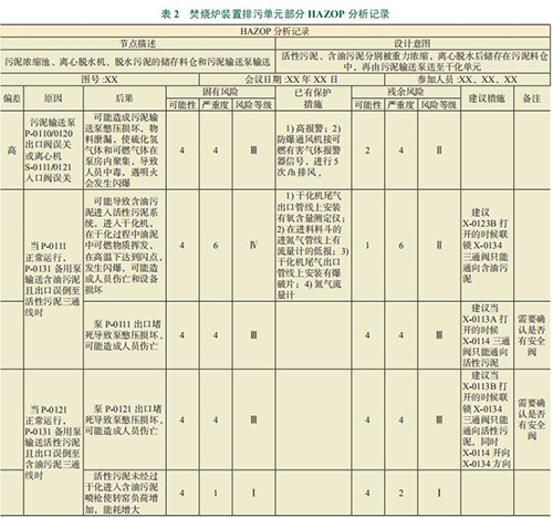 焚燒爐裝置排污單元在下列Ⅳ級(jí)風(fēng)險(xiǎn)、Ⅲ級(jí)風(fēng)險(xiǎn)沒(méi)有核實(shí)整改完成之前運(yùn)行存在較大風(fēng)險(xiǎn)。如表 2 所示,污泥濃縮池、離心脫水機(jī)、脫水污泥的儲(chǔ)存料倉(cāng)和污泥輸送泵輸送節(jié)點(diǎn)中,存在 2個(gè)參與風(fēng)險(xiǎn)等級(jí)在Ⅲ級(jí)以上的問(wèn)題:1)當(dāng) P-0111正常運(yùn)行,P-0131 備用泵輸送含油污泥且出口誤倒至活性污泥三通線時(shí),泵 P-0111 出口堵死導(dǎo)致泵憋壓損壞,可能造成人員傷亡,風(fēng)險(xiǎn)等級(jí)為Ⅲ;2)當(dāng) P-0121 正常運(yùn)行,P-0131 備用泵輸送活性污泥且出口誤倒至含油污泥三通線時(shí),泵 P-0121出口堵死導(dǎo)致泵憋壓損壞,可能造成人員傷亡,風(fēng)險(xiǎn)等級(jí)為Ⅲ。