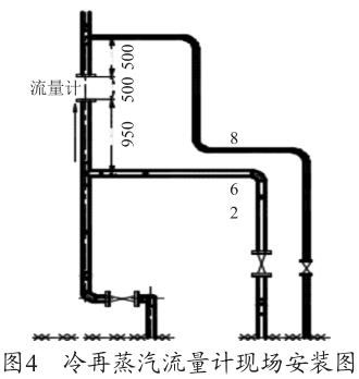 根據(jù)圖1渦街流量安裝要求示意圖及廠家的設備說明書要求,流量計上游的直管段長度至少為20D≈1 300mm,下游的直管段至少在5D≈325mm,D=65mm 為管道直徑。圖4為冷再蒸汽流量計現(xiàn)場安裝圖,流量計上游僅為950mm<1600mm,此流量計安裝位置有誤,對測量值有一定的影響,造成測量偏差,需調整流量計的安裝位置。