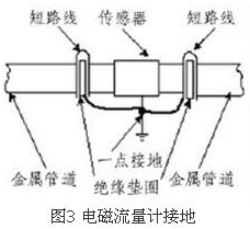 (4)盡量避開振動(dòng)源、磁源(大功率電機(jī)、變壓器)由于智能渦輪流量計(jì)的測量感應(yīng)電壓很小,電壓較低,易受外界電磁噪聲的影響,故在安裝時(shí)應(yīng)進(jìn)行可靠的接地連(跨)接。金屬管道智能渦輪流量計(jì)接地連(跨)接方法如圖3所示