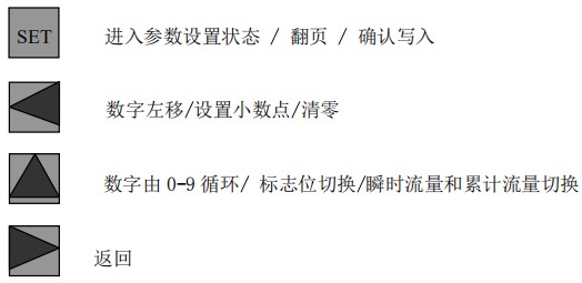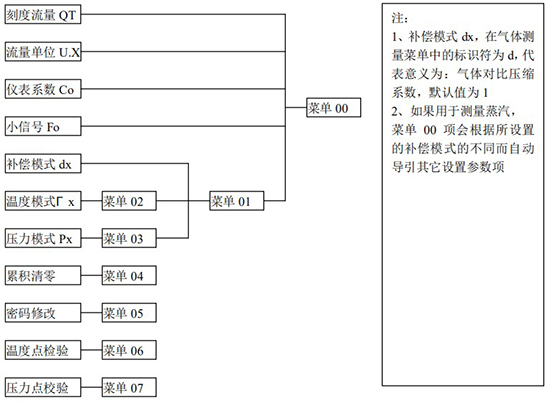 (3)標況流量計算公式(若補償后單位為 U.0):(4)標況流量計算公式(若補償后單位為 U.1):注:標況指 20℃,1 標準大氣壓三、一體化液晶顯示表頭參數(shù)設置操作說明(V03Z)1、鍵盤按鍵說明2、 顯示窗字符說明注:表中 x 代表“0”或“1”;Zn:標準狀態(tài)下(20℃,1 標準大氣壓),被測氣體的壓縮系數(shù),Z:工作狀態(tài)下被測氣體的壓縮系數(shù)3、 操作說明3.1、本儀表表頭采用自導引式和菜單式相結合的參數(shù)設置方式,所謂自導引式參數(shù)設置方式就是用戶在進入菜單 00 項后,表頭中的微電腦會自動導引用戶去設置需要設置的參數(shù)。另外,用戶也可以通過菜單模式分別對各組參數(shù)進行設置。蒸汽測量菜單框圖如下:3.2、參數(shù)設置約定:在設置各項參數(shù)時,提示符閃動代表該項參數(shù)沒有設置完或者尚未確認,可以通過按SET 鍵來確認或者按→鍵退出;提示符不閃動代表該項參數(shù)已設置完并確認,此時可以通過按 SET 鍵翻頁或者按→鍵退出。進入?yún)?shù)設置時,需要輸入密碼(6 位)并確認進入,為了防止誤進入?yún)?shù)設置菜單,保證儀表正常工作,在設置密碼時,使用↑鍵調數(shù)時不能循環(huán)調數(shù),只能單次調數(shù),只有密碼輸入正確進入各項參數(shù)設置菜單后才可以對各位循環(huán)連續(xù)調整數(shù)據(jù)。3.3、儀表參數(shù)設置舉例:儀表出廠前各項參數(shù)已設置好,用戶無需設置。如果用戶需要設置某項參數(shù),請參照以下步驟,例如修改刻度流量值 QT:在工作狀態(tài)下,按 SET 鍵,顯示屏顯示 P,數(shù)字位為全零,8 秒鐘若無操作,自動返回工作狀態(tài)。輸入密碼 :按數(shù)字↑鍵和左移←鍵,輸入密碼數(shù) xxxxx(出廠時默認密碼為 000123),↑鍵調各位數(shù)字 0-9,每按 ←鍵一次數(shù)字向右循環(huán)一位,可通過多次按←鍵對整段數(shù)字清零,按→鍵可以返回工作狀態(tài)。菜單選擇項:按 SET 鍵確認,顯示屏顯示如右圖所示,末行“00”閃動調整該項值選擇不同參數(shù)設置菜單。該例直接按 SET 鍵進入菜單 00 項設置刻度流量:QT 閃動,*一步:*先進行小數(shù)點調整,可以通過←鍵對參數(shù)快速清零或者通過↑鍵進行小數(shù)點調整,調整完畢,按 SET 鍵確認(QT 仍閃動);*二步:數(shù)值調整,可以通過↑鍵對每位數(shù)字進行調整,按 ←鍵一次數(shù)字向右移動一位,調整完畢,按 SET 鍵確認,QT 停止閃動,該項參數(shù)設置完畢,可進行下一項參數(shù)設置或者退出另外,單位設置 U.X 和補償方式設置 dX 通過↑鍵調整修改。3.4、校驗項說明: 儀表出廠前,溫度和壓力通道已校驗設置好,無需用戶重新校驗。校驗通道有密碼保護,廠家不對外開放,如果需要重新校驗溫度或者壓力通道,請專業(yè)人員與廠家技術人員聯(lián)系。4、計算公式說明4.1、蒸汽測量計算公式(1)渦街流量儀表工況體積流量計算公式:(2)密度 d,單位 Kg/m3(3)質量流量計算公式,單位 Kg/h:(4)質量流量計算公式,單位 t/h:4.2、氣體測量計算公式----標況指 20℃,1 標準大氣壓(1)渦街流量儀表工況體積流量計算公式:(2)對比壓縮系數(shù) d(Zn/Z),單位 1(3)標況流量計算公式,單位 Nm3/h:P1—工況絕壓,PN—標況絕壓(Mpa),T1—工況熱力學溫度,TN—標況熱力學溫度(K)