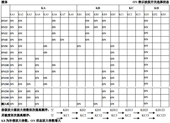 (4)標況流量計算公式,單位 t/h:四、AMPKP09A01 放大板波段開關調整參照表五、AMPSW10A01 放大板波段開關調整參照表RG=1-F 調放大器增益,由 1 至 F 依次增大(常用 4-8);RS=1-F 調觸發(fā)靈敏度,由 1 至 F 依次提高(常用 4-8)不同口徑和介質開關選擇參見附表。并根據(jù)實際信號先調整 K2 和 K3 擴展頻帶,必要時調整 K1 電荷放大器增益以上表值僅供參考,實際使用中因液體粘度和氣體密度不同應在此值附近調整,頻率低時可將 K3 向大口徑方向調一至三檔。頻率高時可將 K2 向小口徑方向調一至三檔。訂貨須知及選型樣譜一.尊敬的用戶,當您要選用本公司產(chǎn)品時,請仔細閱讀選型樣本,并做好以下工作:1.認真核對被測介質的工況條件:溫度、壓力、管徑等工藝參數(shù)。2.認真核對被測介質的使用流量范圍,特別是*小流量值以*終確定使用儀表的口徑及配管參數(shù)。3.確定儀表的安裝地點,保證直管段,并為儀表的安裝維護創(chuàng)造好的環(huán)境條件。4.填好訂貨咨詢單,見附表三二.渦街流量儀表選型表(符合 JB/T9294-1999 標準)1.傳感器選型表上一篇:污水流量計的種類