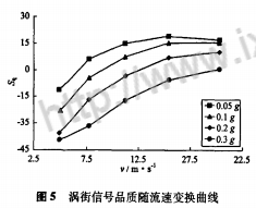圖5給出了不同管道振動加速度下渦街信號品質(zhì)隨流速變化的情況。不論振動加速度如何變換,Sq的變化趨勢都是隨著流速的增加而變大,但Sq何時由負(fù)變正,則與振動加速度密切相關(guān)。相同流速下,管道振動加速度越大,Sq值越小,渦街信號品質(zhì)越差。Sq小于零時,表明由振動引起的其他頻帶能量大于渦街頻帶能量,且Sq絕對值越大,渦街信號品質(zhì)越差,渦街流量計的測量誤差越大;Sq大于零時,表明渦街頻率帶的能量大于其它頻帶的能量,管道振動對渦街信號影響較小,且Sq值越大,渦街信號品質(zhì)越好,渦街流量計的測量誤差越小。這也與圖3(a)得到的試驗結(jié)果完全吻合。