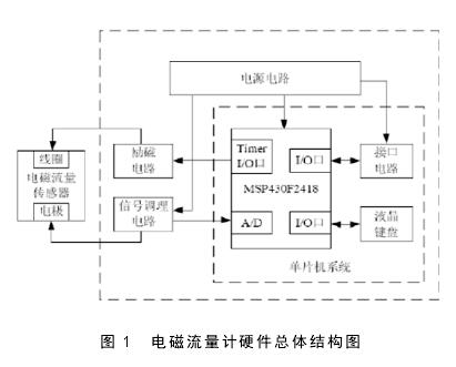 新型固井電磁泥漿流量計(jì)的硬件部分是由電源電路、傳感器、信號(hào)采集處理電路、勵(lì)磁電路以及接口電路共同組成。如圖 1 所示,為電磁流量計(jì)硬件總體結(jié)構(gòu)。