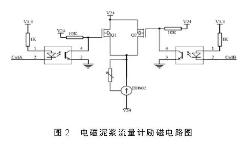 圖中的勵(lì)磁電路工作內(nèi)容是控制儀表的工作磁場(chǎng)。其作用原理為 :?jiǎn)纹瑱C(jī) MSP430F2418 定時(shí)器產(chǎn)生了雙頻矩形波,并經(jīng)光耦隔離后與兩片場(chǎng)效應(yīng)管組成了開關(guān)電路,從而實(shí)現(xiàn)了泥漿流量計(jì)使用的通斷功能。另一個(gè)電路 DH902 是恒流管,其為設(shè)備使用提供恒定的勵(lì)磁電流。具體來說,當(dāng) MCU 定時(shí)器的脈沖寬度調(diào)制(PWM)輸出后,經(jīng)過濾波就能有效控制勵(lì)磁電流的幅值,進(jìn)而產(chǎn)出雙頻矩形波。如圖 2 所示,為電磁泥漿流量計(jì)勵(lì)磁電路圖。