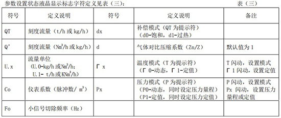 (3)標況流量計算公式(若補償后單位為 U.0):(4)標況流量計算公式(若補償后單位為 U.1):注:標況指 20℃,1 標準大氣壓三、一體化液晶顯示表頭參數(shù)設置操作說明(V03Z)1、鍵盤按鍵說明2、 顯示窗字符說明注:表中 x 代表“0”或“1”;Zn:標準狀態(tài)下(20℃,1 標準大氣壓),被測氣體的壓縮系數(shù),Z:工作狀態(tài)下被測氣體的壓縮系數(shù)3、 操作說明3.1、本儀表表頭采用自導引式和菜單式相結合的參數(shù)設置方式,所謂自導引式參數(shù)設置方式就是用戶在進入菜單 00 項后,表頭中的微電腦會自動導引用戶去設置需要設置的參數(shù)。另外,用戶也可以通過菜單模式分別對各組參數(shù)進行設置。蒸汽測量菜單框圖如下:3.2、參數(shù)設置約定:在設置各項參數(shù)時,提示符閃動代表該項參數(shù)沒有設置完或者尚未確認,可以通過按SET 鍵來確認或者按→鍵退出;提示符不閃動代表該項參數(shù)已設置完并確認,此時可以通過按 SET 鍵翻頁或者按→鍵退出。進入?yún)?shù)設置時,需要輸入密碼(6 位)并確認進入,為了防止誤進入?yún)?shù)設置菜單,保證儀表正常工作,在設置密碼時,使用↑鍵調數(shù)時不能循環(huán)調數(shù),只能單次調數(shù),只有密碼輸入正確進入各項參數(shù)設置菜單后才可以對各位循環(huán)連續(xù)調整數(shù)據(jù)。3.3、儀表參數(shù)設置舉例:儀表出廠前各項參數(shù)已設置好,用戶無需設置。如果用戶需要設置某項參數(shù),請參照以下步驟,例如修改刻度流量值 QT:在工作狀態(tài)下,按 SET 鍵,顯示屏顯示 P,數(shù)字位為全零,8 秒鐘若無操作,自動返回工作狀態(tài)。輸入密碼 :按數(shù)字↑鍵和左移←鍵,輸入密碼數(shù) xxxxx(出廠時默認密碼為 000123),↑鍵調各位數(shù)字 0-9,每按 ←鍵一次數(shù)字向右循環(huán)一位,可通過多次按←鍵對整段數(shù)字清零,按→鍵可以返回工作狀態(tài)。菜單選擇項:按 SET 鍵確認,顯示屏顯示如右圖所示,末行“00”閃動調整該項值選擇不同參數(shù)設置菜單。該例直接按 SET 鍵進入菜單 00 項設置刻度流量:QT 閃動,*一步:*先進行小數(shù)點調整,可以通過←鍵對參數(shù)快速清零或者通過↑鍵進行小數(shù)點調整,調整完畢,按 SET 鍵確認(QT 仍閃動);*二步:數(shù)值調整,可以通過↑鍵對每位數(shù)字進行調整,按 ←鍵一次數(shù)字向右移動一位,調整完畢,按 SET 鍵確認,QT 停止閃動,該項參數(shù)設置完畢,可進行下一項參數(shù)設置或者退出另外,單位設置 U.X 和補償方式設置 dX 通過↑鍵調整修改。3.4、校驗項說明: 儀表出廠前,溫度和壓力通道已校驗設置好,無需用戶重新校驗。校驗通道有密碼保護,廠家不對外開放,如果需要重新校驗溫度或者壓力通道,請專業(yè)人員與廠家技術人員聯(lián)系。4、計算公式說明4.1、蒸汽測量計算公式(1)渦街流量儀表工況體積流量計算公式:(2)密度 d,單位 Kg/m3(3)質量流量計算公式,單位 Kg/h:(4)質量流量計算公式,單位 t/h:4.2、氣體測量計算公式----標況指 20℃,1 標準大氣壓(1)渦街流量儀表工況體積流量計算公式:(2)對比壓縮系數(shù) d(Zn/Z),單位 1(3)標況流量計算公式,單位 Nm3/h:P1—工況絕壓,PN—標況絕壓(Mpa),T1—工況熱力學溫度,TN—標況熱力學溫度(K)